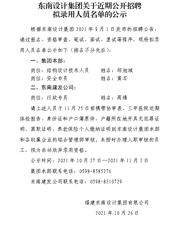 東南設(shè)計(jì)集團(tuán)關(guān)于近期公開(kāi)招聘 擬錄用人員名單的公示