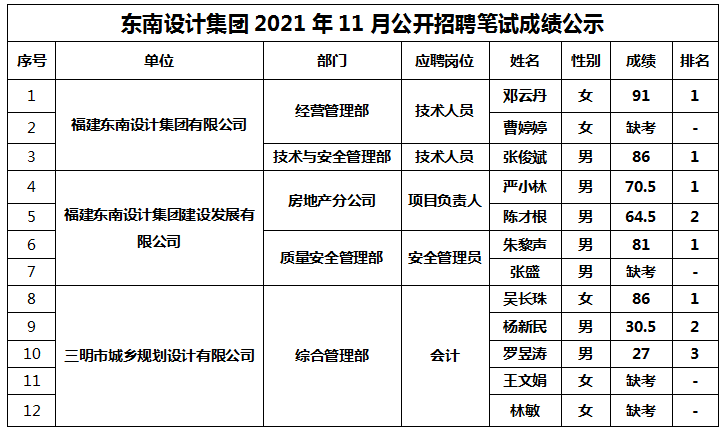 根據(jù)城發(fā)集團(tuán)官網(wǎng)2021年11月9日發(fā)布的《東南設(shè)計(jì)集團(tuán)關(guān)于公開招聘工作人員的公告》,現(xiàn)將各崗位筆試人員成績(jī)公示如下: